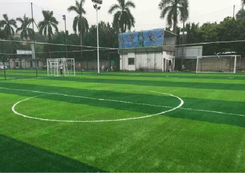 幼兒園人造草坪噴面調制好噴面料,用專用噴涂機整體噴涂兩遍。